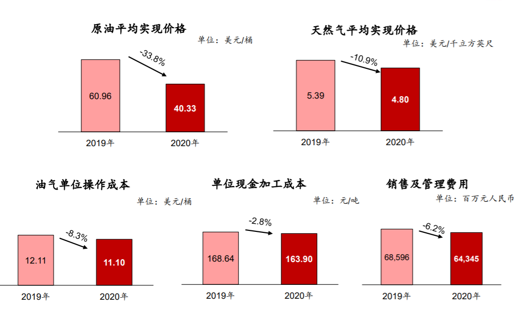 2020年,中国石油的原油平均实现价格降至40.33美元/桶,同比减少33.8%;天然气平均实现价格4.8美元/千立方英尺,同比减少10.9%。