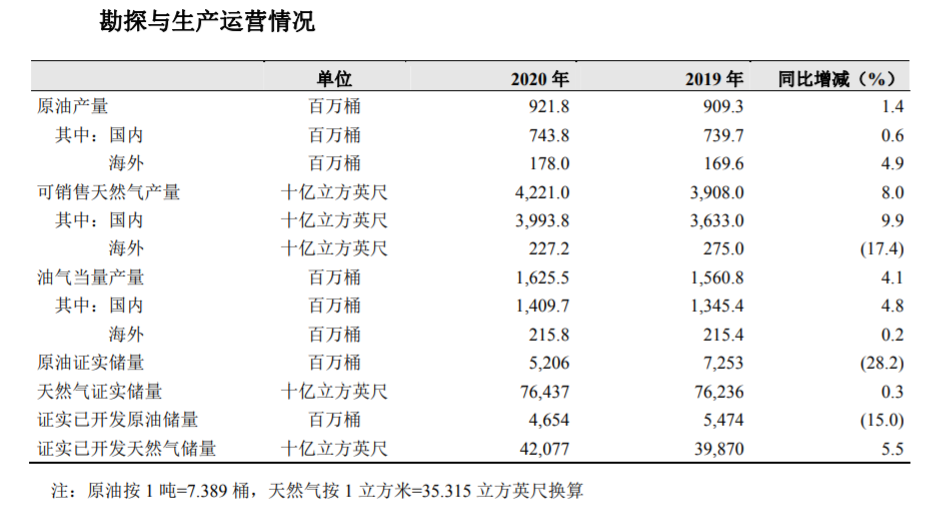 2020年,中国石油油气当量产量16.26亿桶,同比增长4.1%。其中,生产原油9.22亿桶,同比增长1.4%;可销售天然气产量4.22万亿立方英尺,同比增长8%;
