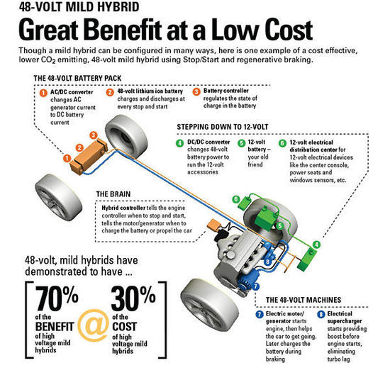 48V微混技术,结构改动小,成本低廉,性价比高。有调查显示,48V MHEV架构是PHEV架构成本的30%,但却提供了PHEV车型70%的优点。
