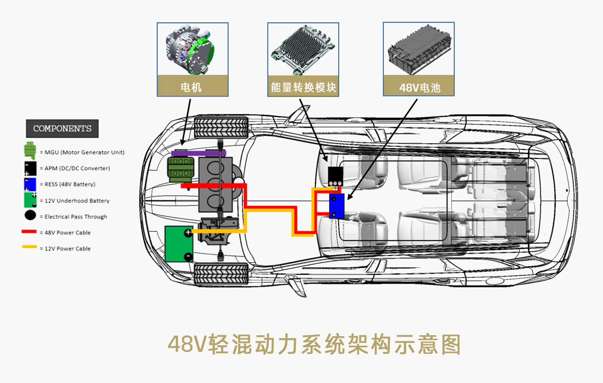 目前广泛量产的48V轻混系统,核心部件包括48V电池、48V起动电机/发电机、48V/12V(DC/DC)电压逆变器与控制模块。