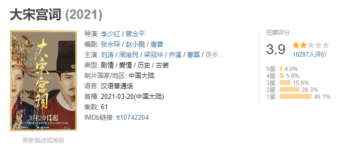 但官宣定档3月20日时,《大宋宫词》却被北京卫视、江苏卫视双双“抛弃”,作为出品公司之一的爱奇艺也未对其采取独播策略,反选择与腾讯视频、优酷共同联播,而这显然已提前预示了《大宋宫词》当下的窘境。