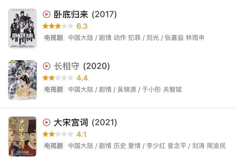 一手栽培成长的艺人相继出走,经纪人员和宣传团队资源也随之流失,更致命的是,公司自制剧集的数量也在急速锐减。据我们统计,2015年—至今,荣信达只推出了《卧底归来》《长相守》(原名《木槿花西月锦绣》)以及《大宋宫词》三部剧集作品,且豆瓣口碑最突出的《卧底归来》仅为6.3。