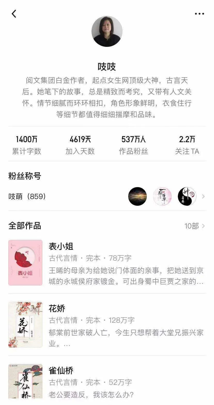 作为阅文白金作家,吱吱从2008年开始在起点中文网发布网络小说,在2020年中国网络文学女频作家影响力榜单上排名第二,迄今已经发表了十部作品,累计1400万字。其中,作品《金陵春》《慕南枝》荣获国家图书馆永久典藏,《九重紫》《花娇》等作品也备受市场青睐,进入到影视化改编当中。