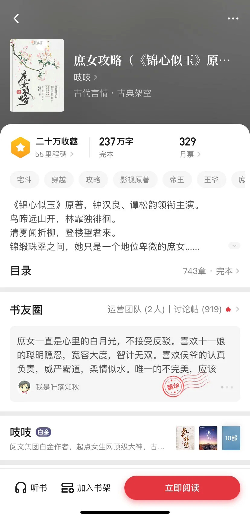 在读娱君看来,在女性地位提升、推崇女性个人价值的当下,《锦心似玉》原著的人物设定与现实社会深度接轨,让用户产生强烈的自我认同与情感共鸣,这也是作品受大众喜欢的一大原因。