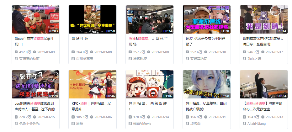 3月7日,《原神》官方在微博发布的联动预告,玩家购买指定套餐并对店员说出口令“异世相遇,尽享美味”,才能获取联动徽章,这一羞耻度极高的口令直接成为up主们吐槽和梗图制作最好素材。自活动预热活动开始,B站出现了大量百万播放量以上活动视频,其中的精品作品还被同步到微博、贴吧等其他社区。