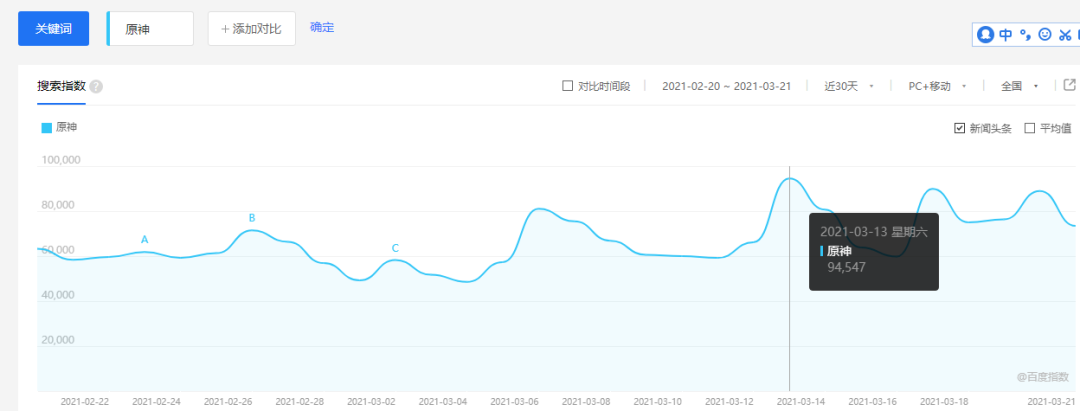 据百度指数显示,联动活动热度在3月13日当天达到高潮,原神相关关键词在PC及移动端热度指数高达94547,而在与原神二次元属性更为契合的B站,相关视频连续霸榜生活区,并在全站热度接近前十。