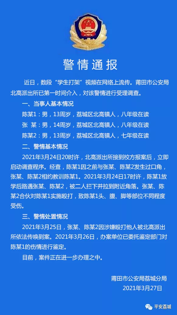 据“平安荔城”微信公众号3月27日消息,近日,数段“学生打架”视频在网络上流传。莆田市公安局北高派出所已第一时间介入,对该警情进行受理调查。