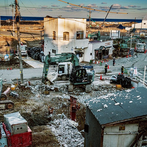 一个地方保护协会的成员穿着老虎服坐在大槌湾的码头上,每年当地人都会身着这种传统服饰载歌载舞,为捕鱼季节取得好收成祈祷。2011年,当海啸袭来时,海水形成了一面6.4米的高墙,损毁了无数桥梁。许多居民在海啸中损失了谋生的手段。如今,大槌开始恢复,但重建工作还须数年才能完成。
