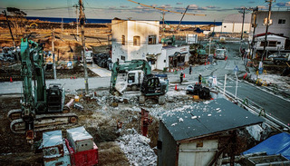 海啸损坏的建筑物仍然屹立在那里,被撞成易拉罐一样的汽车堆积着,被海啸淹没过的自动贩卖机竟然还能使用。背景的那些袋子里装满了放射性土壤