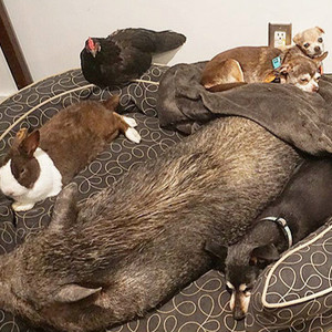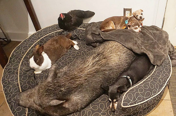 它们包括但不限于:10只狗,一头名为比基尼的自以为是只狗的猪,两只鸡,两只鸭,两只鸽子,一堆猫,一只兔子,还有一窝锦鲤。