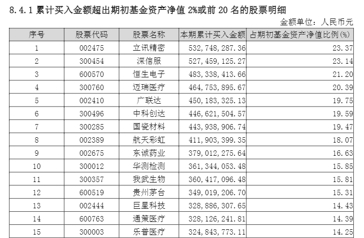 除前十大重仓股外,该基金还“隐形”持有了深信服(300454)、立讯精密(002475)、航天彩虹(002389)、巨星科技(002444)、中炬高新(600872)等股票,除持有中炬高新占基金资产净值比2.67%外,其他4只“隐形重仓股”占基金资产净值比均超过3%。