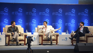3月27日上午,2016中国(深圳)IT领袖峰会正式开幕。在开幕式和前沿科学新技术论坛结束后,联想集团董事长杨元庆、腾讯董事会主席马化腾、百度董事长李彦宏和乐视董事长贾跃亭这四位中国互联网大佬,进行了一场关于IT创新与共享经济的巅峰对话。
