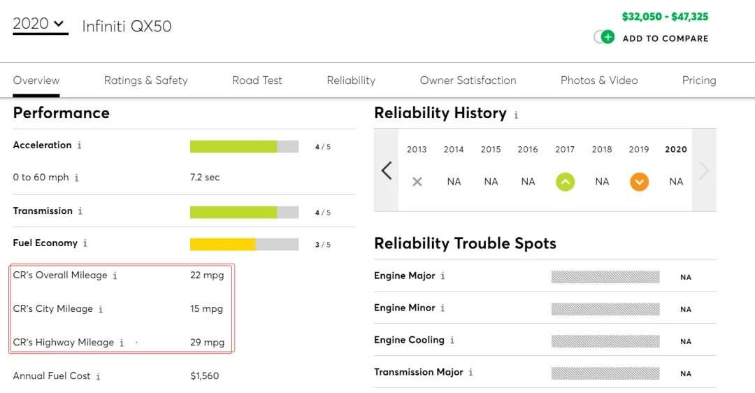 在美国EPA测试中,搭载了可变压缩比发动机的英菲尼迪QX50综合油耗为26mpg(约为9L/100km),这是QX50四驱版本的数据,而美国《消费者报告》对同样配置的车型进行了模拟实际使用状况的油耗测试后,得出的结果是22mpg(约为10.7L/100km)。