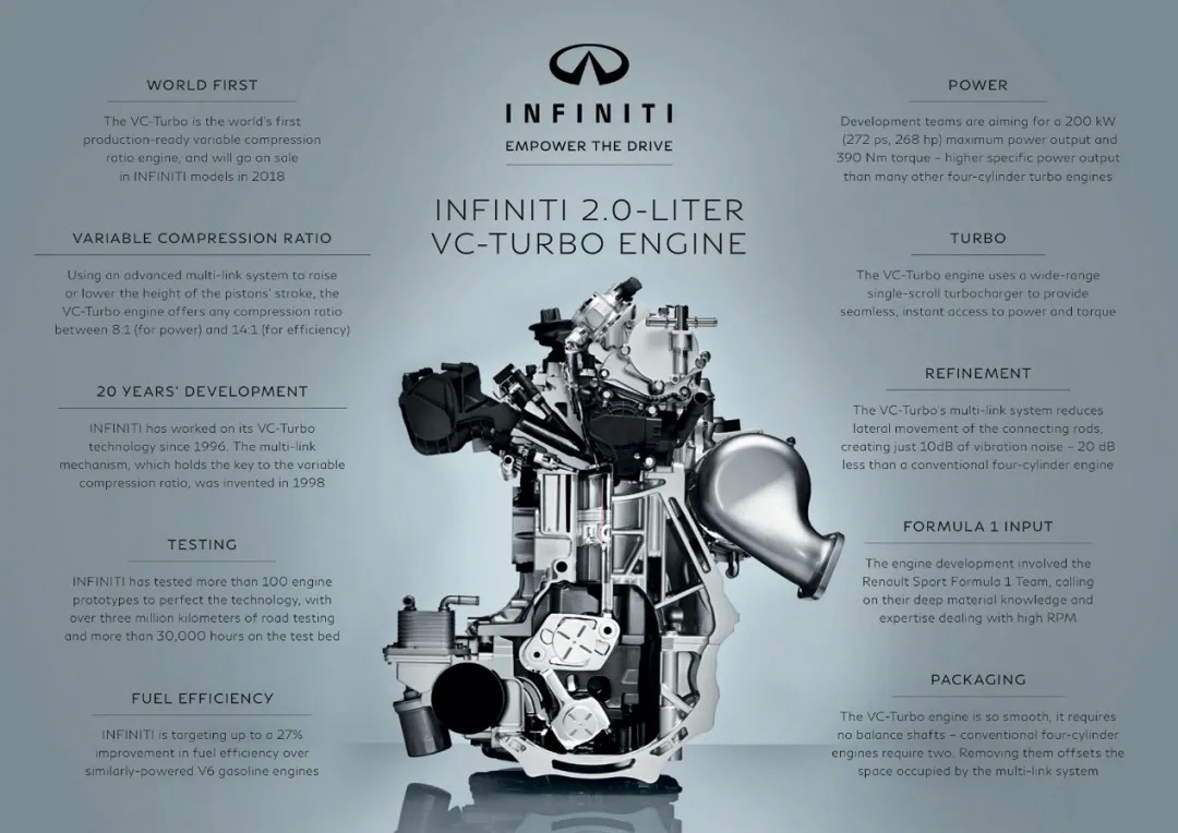 这款排量为2.0L的VC-Turbo发动机与2005年日产发布的VCR可变压缩比发动机颇有相似之处,采用当时日系颇为流行的双喷射、双循环技术,可以通过一套特殊的多连杆机械系统实现低转增加压缩比、高转降低压缩比的效果,以达到性能和效率的优化。