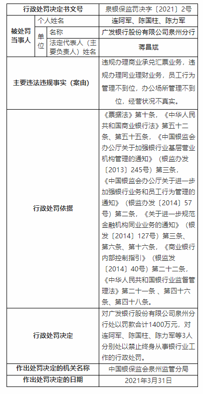 银保监会泉州监管分局决定对广发银行股份有限公司泉州分行处以罚款合计1400万元,对连阿军、陈国柱、陈力军等3人分别处以禁止终身从事银行业工作的行政处罚。
