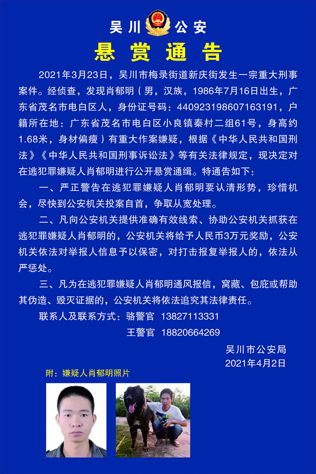 据“平安吴川”微信公众号4月2日消息,2021年3月23日,广东吴川市梅录街道新庆街发生一宗重大刑事案件,犯罪嫌疑人肖某明在逃。警方发布悬赏通告,凡向公安机关提供准确有效线索、协助抓获犯罪嫌疑人的,公安机关将给予人民币3万元奖励。