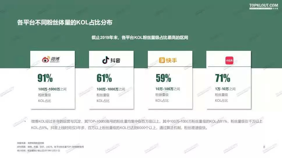 小红书的KOL大多为粉丝数只有1-10万之间的腰部KOL。2020年3月,克劳锐发布《2020年看得见的粉丝价值:四大平台KOL粉丝分析研究报告》显示,不同的社交平台的KOL粉丝体量分布有所差别。其中微博和抖音KOL的粉丝量级都是100-1000万之间的级别为主;快手KOL以10-100万之间的粉丝量级为主;而小红书则71%的KOL粉丝量级在1-10万之间。