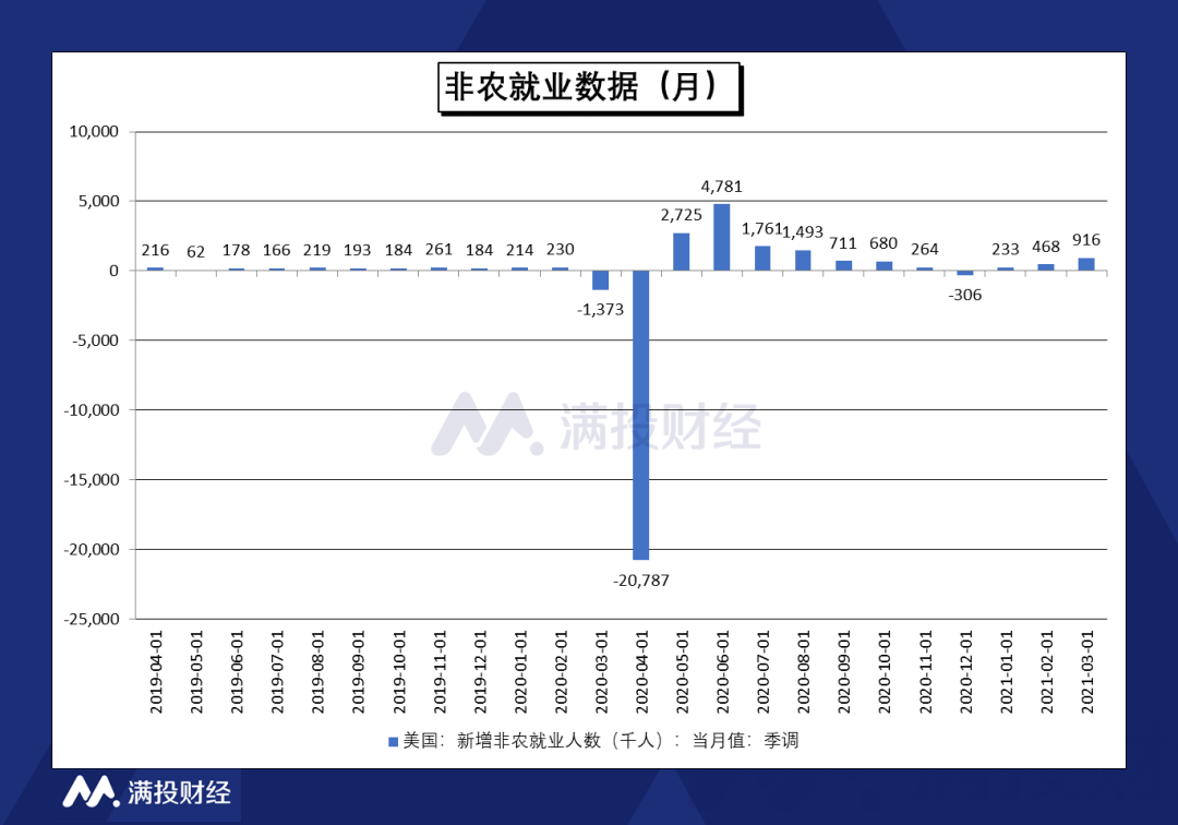 美国3月新增非农数据大超预期,新增非农就业人数为91.6万人,高于市场预期的64万人,同时失业率降至6.0%,较上月下降0.2个百分点。新增非农就业人数与近期美国经济数据表明在多轮财政宽松刺激下,美国的社会总需求与就业率稳步上升。