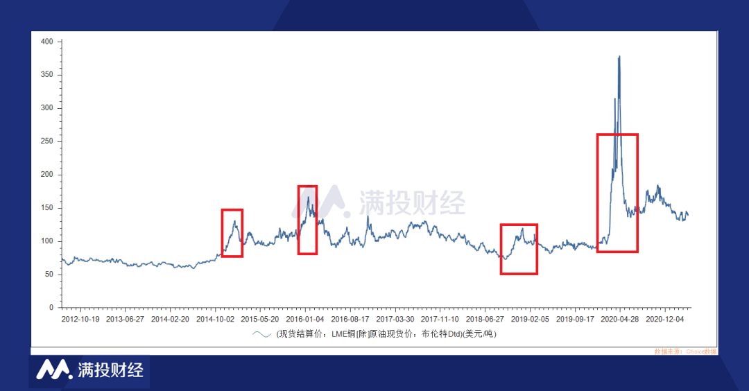 说到铜油价格背离,不得不提及铜油比价,即铜价与油价比值指标(本文数据采用LME现货价与布伦特原油现货价比值)。当铜油价格背离时候,铜油比价往往出现较大的上涨。