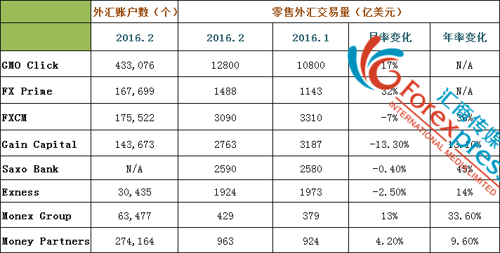 在汇商报道的全球外汇经纪商2月份交易量中,可以看到当月整体交易量都相比1月下滑。而在一片下滑趋势中,日本外汇经纪商的表现则非常抢眼,GMO Click集团及Monex集团的交易量环比涨幅保持在13%以上。纵观全球交易数据,2月份零售交易量最高的是GMO Click,为144.3万亿日元(约1.28万亿美元)。排在其后的是GMO Click集团的外汇业务FX Prime,交易量达到16.8万亿日元(约1488亿美元),环比涨幅达到32%。