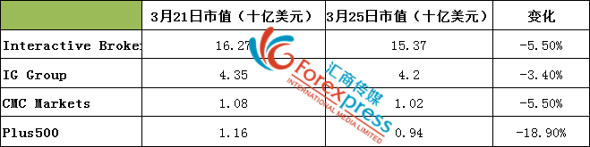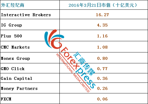 受到汇市不断的波动及各公司运营的影响,各公司股价也一致处于变化中。就英国市场来说,截止2016年3月21日周一,4家市值最高的外汇经纪商分别为盈透证券、IG集团、Plus500以及CMC Markets。时隔几天,至3月25日周五,这4家外汇经纪商的市值均有不同程度的变化: