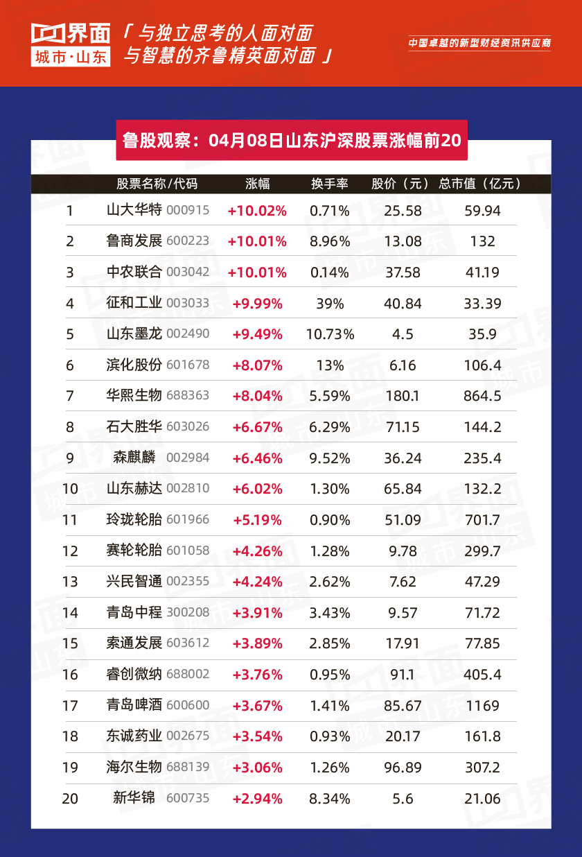 山东上市企业今日突出表现如下: