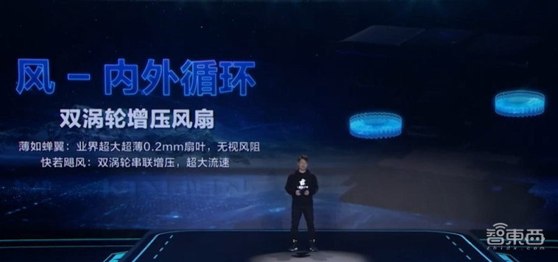 机身中部内置了两颗风扇,可以从外部看到,风扇扇叶仅有0.2mm厚,减小风阻。这两颗风扇组成了内部风道,可以更好地将热量排出,据称最高每分钟可以将风道内空气交换750次。