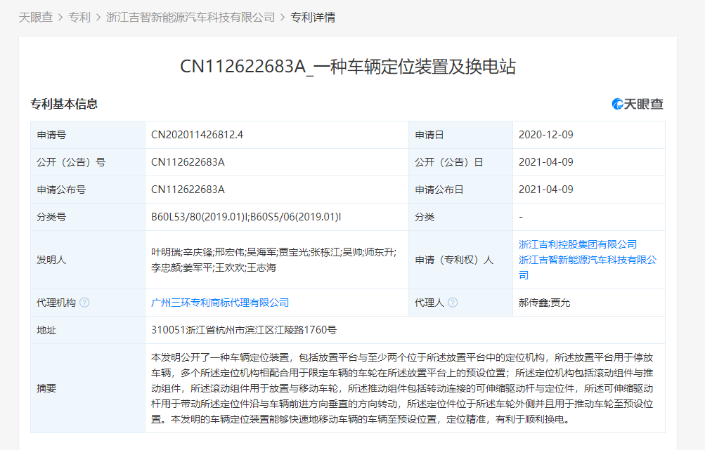 据天眼查APP显示,4月9日,浙江吉利控股集团有限公司公开一项名为“一种车辆定位装置及换电站”的发明专利,申请日期为2020年12月,公开号为CN112622683A。