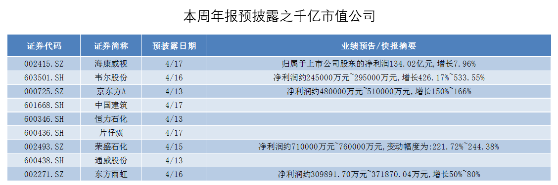 根据计划,本周将有402家公司披露2020年年报,包括海康威视(002415.SZ)、韦尔股份(603501.SH)、京东方A(000725.SZ)、中国建筑(601668.SH)、恒力石化(600346.SH)等9家市值超千亿的公司。199家公司已提前披露了业绩预告,其中预增96家,扭亏公司26家,预减公司37家,预亏公司38家,不确定2家。