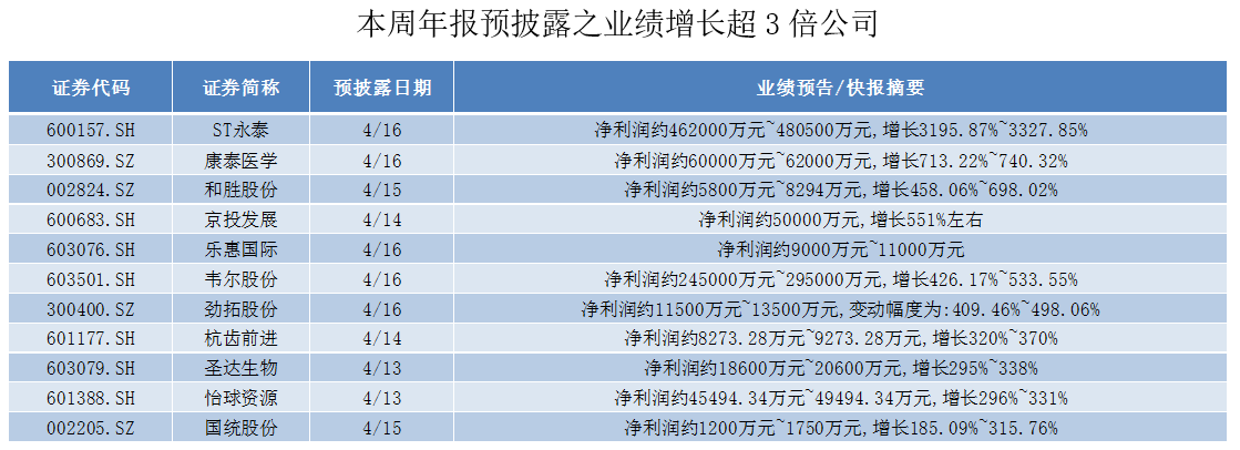 剔除扭亏公司,本周将披露年报的公司中预计净利润增长至少翻倍的公司共有44家。不过对待业绩高增长个股,要尤为注意其背后的原因。