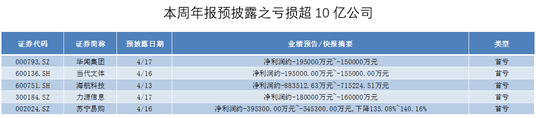 本周亏损超过10亿的公司有5家,且均为首亏。其中海航科技(600751.SH)亏得最多,归属于上市公司股东的净利润-97.89亿元;苏宁易购(002024.SZ)其次,预计净利润-39.53亿元至-34.53亿元,同比下降135.08%-140.16%。