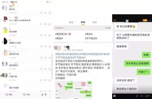 微博是代考机构常用的揽客途径之一,代考机构在发布微博内容时加上大厂笔试的相关话题,来寻找客源或者方便客源寻找。在一些博主推送笔试代考的微博之下,不少网友都在底下评论“太棒了”、“不错不错”之类的言论,对这种方式表示赞同。甚至还有博主晒出私信显示,不少人通过这种方式拿到了大厂面试的机会。