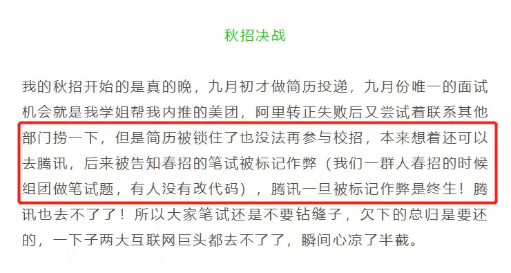 2020年1月18日,有作者“谱戈”在微信公众号“编程剑谱”上发表了一篇文章《一个菜逼程序媛的求职历程》,对所有要参加校招的同学讲述了自己求职的心路历程,在文章的最后,他提到了自己春招作弊的事情,该作者称在参加腾讯春招笔试的时候,由于组团做笔试题,被告知标记作弊,而一旦被腾讯标记作弊,就会被鹅厂终生禁录。