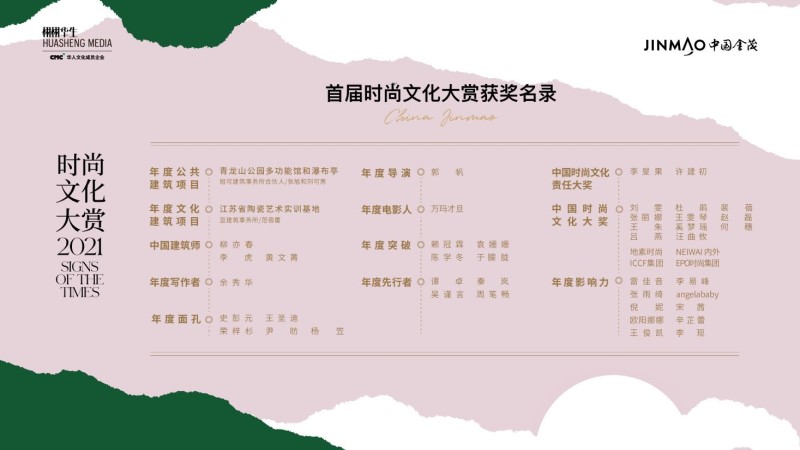 为表彰文学、时尚、建筑、影视、科技等领域的“时代印记”,首届“时尚文化大赏”设置了 12个重要奖项,颁发给最具代表性的年度人物与事件。获奖者中,包括极具时代标志意义的中国优秀艺术家、时尚从业者、明星、企业家、文化人等,其中不乏多位金茂业主。