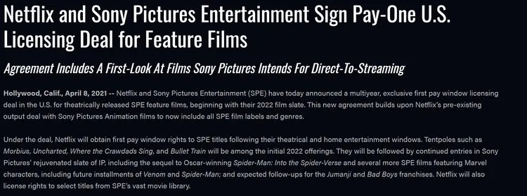 先是被曝与Netflix签订了一份多年独家付费窗口授权协议,Netflix成为2022年起独家拥有索尼内容播放权的平台,包括《暗夜博士:莫比亚斯》《神秘海域》和新《蜘蛛侠》电影等将在Netflix上线。此外,索尼影业将为Netflix制作2-3部直接在流媒体平台播放的电影。