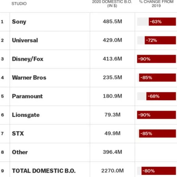 确实吓人一跳,毕竟多年来索尼影业都牢牢占据着好莱坞“六大”票房第五的位置,和长年第六的派拉蒙可谓难兄难弟。但实际上,2020年索尼的年度北美票房也仅为4.855亿美元,主要依靠上年底上映的《勇敢者游戏2》《小妇人》及年初开画的《绝地战警3》。