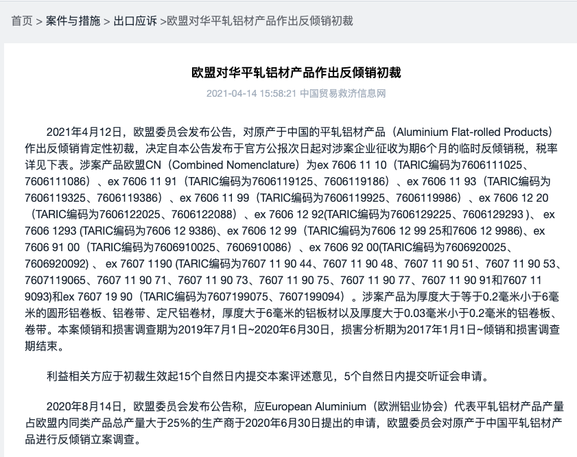 2020年8月14日,欧盟委员会发布公告称,应European Aluminium(欧洲铝业协会)代表平轧铝材产品产量占欧盟内同类产品总产量大于25%的生产商于2020年6月30日提出的申请,欧盟委员会对原产于中国平轧铝材产品进行反倾销立案调查。
