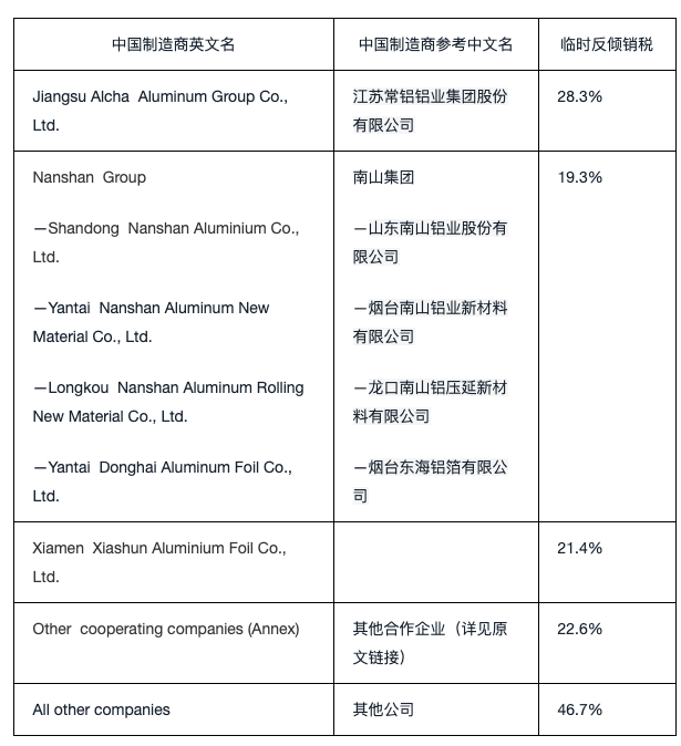 中国贸易救济信息网4月14日消息,2021年4月12日,欧盟委员会发布公告,对原产于中国的平轧铝材产品(Aluminium Flat-rolled Products)作出反倾销肯定性初裁,决定自本公告发布于官方公报次日起对涉案企业征收为期6个月的临时反倾销税,税率详见下表。涉案产品为厚度大于等于0.2毫米小于6毫米的圆形铝卷板、铝卷带、定尺铝卷材,厚度大于6毫米的铝板材以及厚度大于0.03毫米小于0.2毫米的铝卷板、卷带。