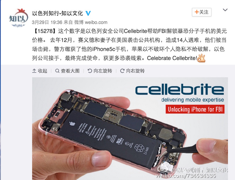 不过据“以色列知行-知以文化”的微博透露,此次FBI支付给Cellebrite的价格是15278美元。