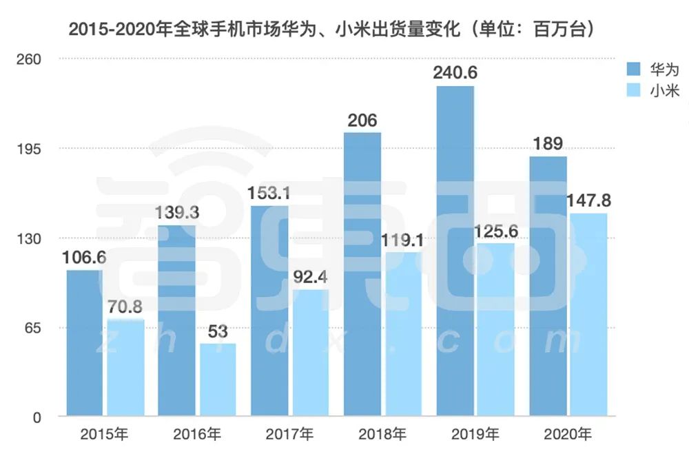 2015-2020年全球手机市场中,华为、小米的出货量变化(数据来源:IDC)