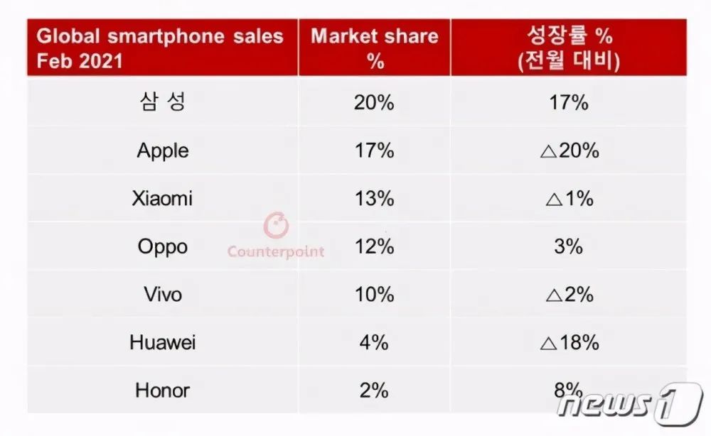 就在华为快冲顶全球第一之时,美国政府的一文禁令直接拖住了华为的发展步伐。2020年第四季度,华为在国内市场仍保持第一,但出货量同比下滑34.5%,在全球市场占有率更是由去年同期的第三名跌至第五名。