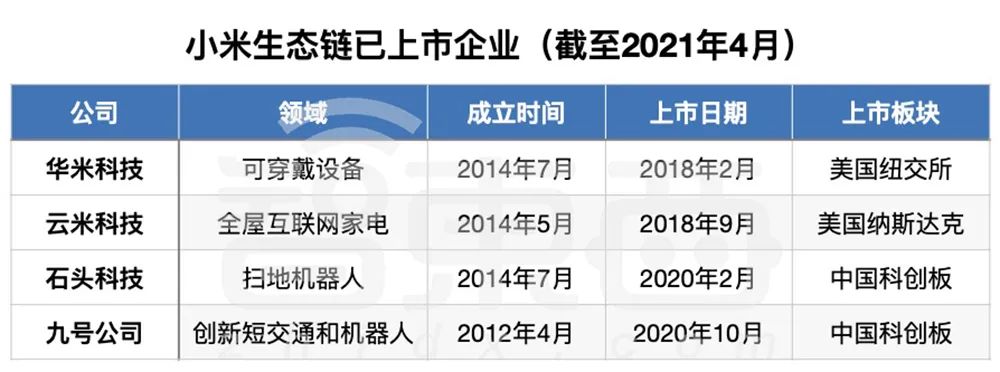 一方面,小米从2013年开始就开始通过投资,逐步构建一幅小米生态链版图,覆盖智能家居、可穿戴设备、AR/VR、手机周边、出行等各个领域。在小米投资的这些企业中,目前已有4家企业成功IPO上市,分别为华米科技、云米科技、石头科技、九号公司。