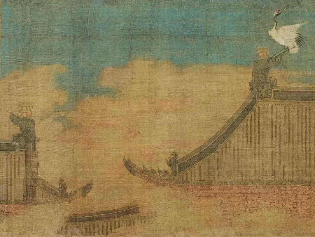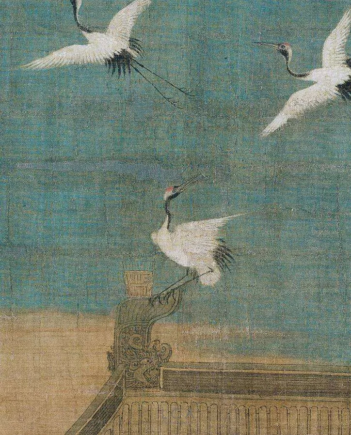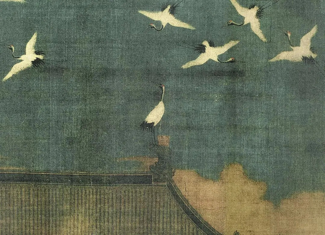 此时,皇宫正南的宣德楼城门上,不知从哪儿飞来一群仙鹤,也许是被庄严的音乐吸引,它们一下子铺满徽宗眼前的天空。靛蓝色的琼宇,化作白鹤起舞的布景,高耸的城楼殿顶,脊背成为群鹤的舞台。