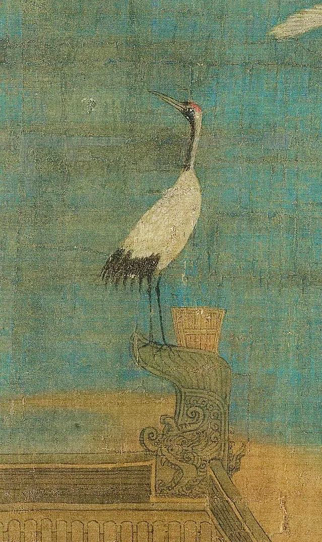 除去仙鹤与城门,画面中第三个元素——祥云,没有明确的线条勾勒,团状簇拥着城门左右,更显云雾缭绕而气势蒸腾。祥云的虚,与仙鹤、城楼的实,交相辉映;静态的天空云雾,与动态的飞鹤翩跹,对照成趣。构成了一组和谐、生动的天空之城的意境。祥云,它更是作为人间帝王到天界仙人的过渡与接引,象征了宋徽宗心中羽化登仙的美梦与遐想。