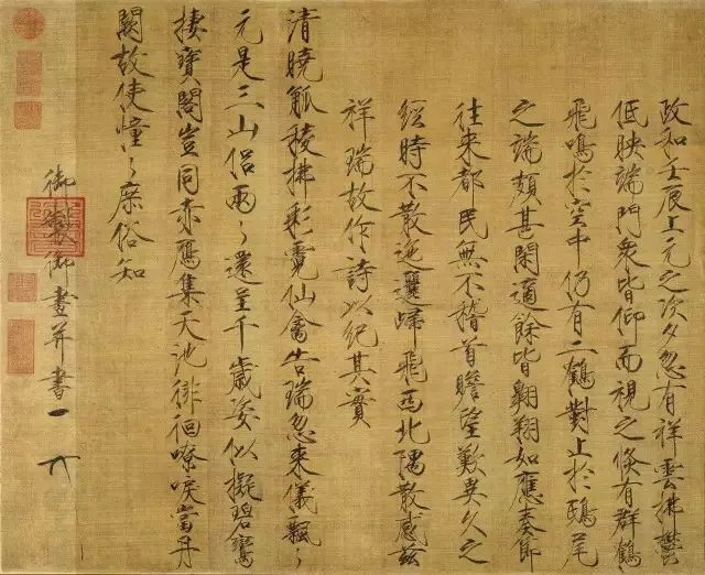 他在旁亲笔题字,写下此画创作的缘由,并赋诗一首,诗书画意,相得益彰。他的书法“瘦金体”,也正被称为“鹤体”。全文如下:“政和壬辰上元之次夕,忽有祥云拂郁,低映端门。众皆仰而视之。倐有群鹤飞鸣于空中,仍有二鹤对止于鸱尾之端,颇甚闲适。馀皆翱翔,如应奏节,往来都民无不稽首瞻望,叹异久之。经时不散。迤逦归飞西北隅,散。感兹祥瑞,故作诗以记其实。