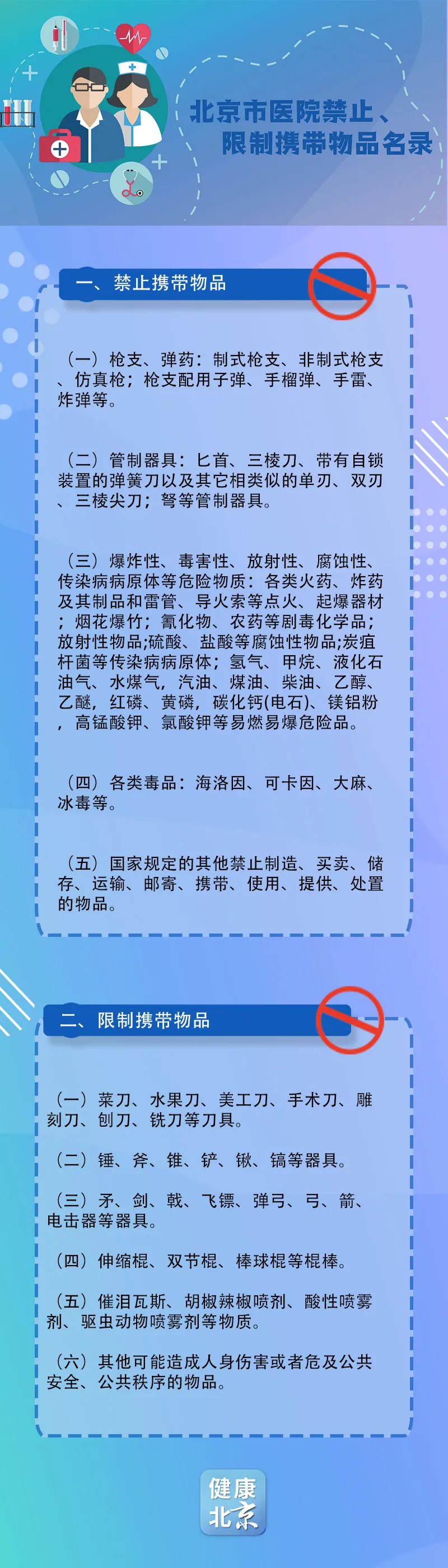据北京市卫健委消息,目前,北京市实施安检的医院有237家,其中三级医院基本实现全覆盖。4月15日,北京市公安局会同市卫健委联合解读《北京市医院禁止限制携带物品名录》。名录严格依法明确禁限带物品范围,并通过对近年来侵害医护人员、扰乱医院秩序的案件进行综合分析,从加强针对性防范、源头堵塞漏洞的角度,禁止携带管制器具、危险物质等五类物品,限制携带菜刀、棍棒等六类物品进入医院。各大医院设置了急危患者安全检查绿色通道,设立了临时寄存处。