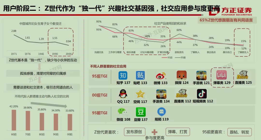 据方正证券的报告显示,以知乎、B站为代表的社区产品,因为“兴趣社交”的基因,而获得了更高的参与度,深受95后的喜爱。