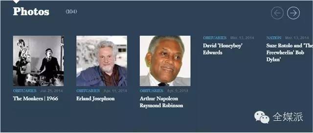 《洛杉矶时报》则有一个讣告图片版,里面有海量的逝者图片,这些跃然而现的人像特写触动着读者的神经,好似这些逝者从未离去,一直都在我们身边。
