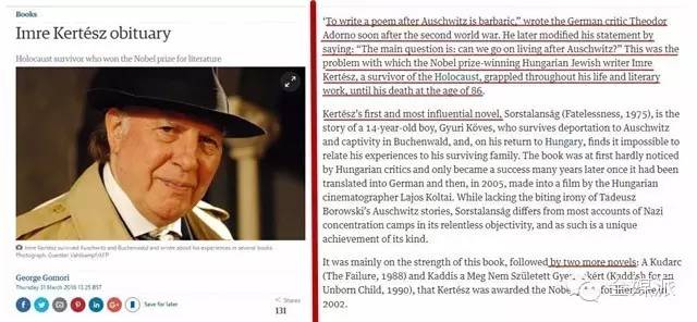 这篇讣告开头写道:“‘如果待过奥斯维辛集中营还能写诗,是不可想像的。’第二次世界大战后,德国评论家Theodor Adorno说道。但是,很快,他又修正了自己的这番话:‘最主要的问题是,在经历了奥斯维辛集中营的日子后,我们还能继续生活吗?’这正是大屠杀的幸存者、诺贝尔文学奖获得者凯尔泰斯·伊姆雷为之挣扎的问题,这个问题一直伴随着他的生活与文学创作,直到他于86岁逝世。”