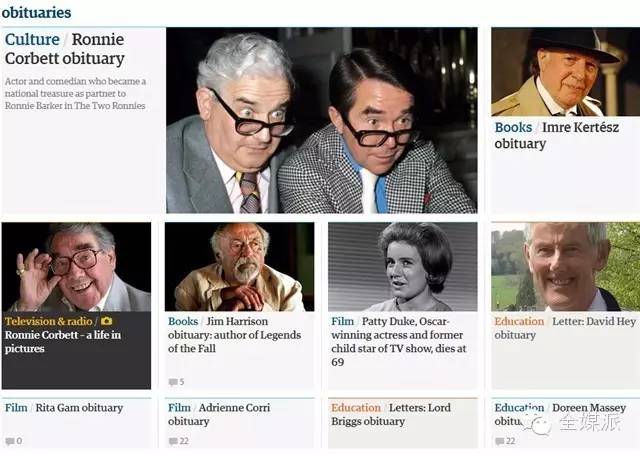 《卫报》的讣告版面图文并茂,色彩鲜明。每个逝者都是以搞怪或微笑的形象出现,让人们缅怀他们的同时会心一笑。死亡,已经不是悲伤的代名词,它更像是一种艺术,一场温情的谢幕。
